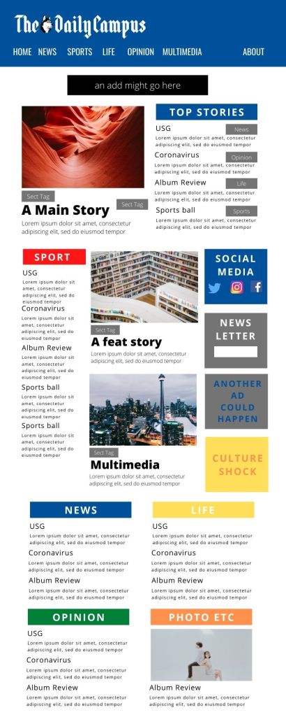 There were two main facets of our research: evaluating what didn’t work from our old website, and drawing on inspiration from news websites outside of organization. The former involved meeting with members of The Daily Campus to evaluate their opinions of our website and running surveys to glean what people generally didn’t like about the website.